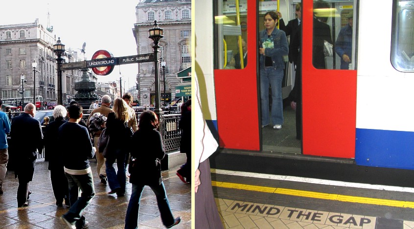 Left, typical "tube" sign on a London street; right, travelers are cautioned
