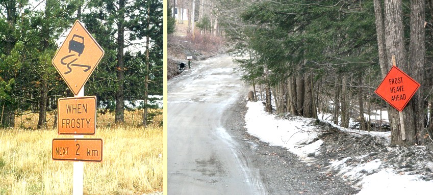 During our recent spring break trip to Vermont, we encountered many "Frost Heave" signs. They were located anywhere that the winter freezing and thawing had caused the road to rise up or sink in. But "Bump" signs were also common. We weren't sure why they differentiated between them for we were jostled around the same.