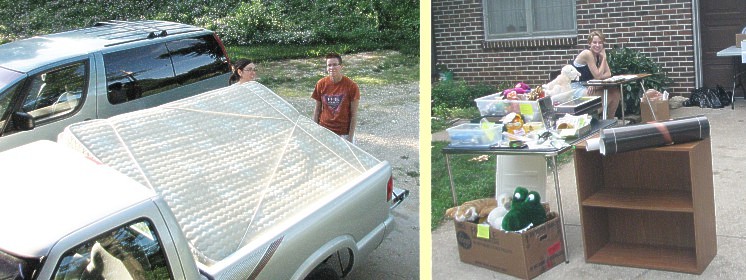 Left: Lacey and Mariya moving bedsprings to their new apartment; right: Katie