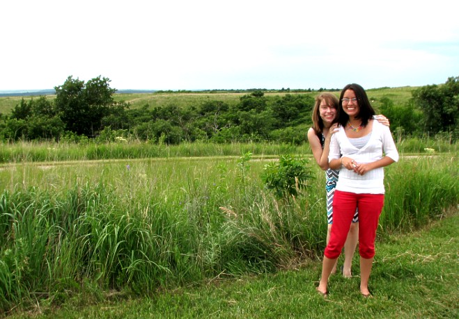 Katie, left, and cousin Larisa pose before the Flint Hills along Kansas