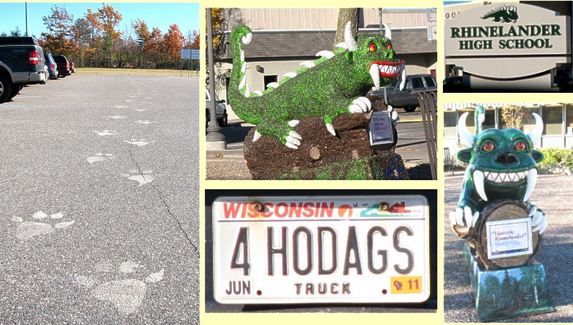 seen at local business; right-top, marker in front of Rhinelander high school; right-bottom, historical Hodag.