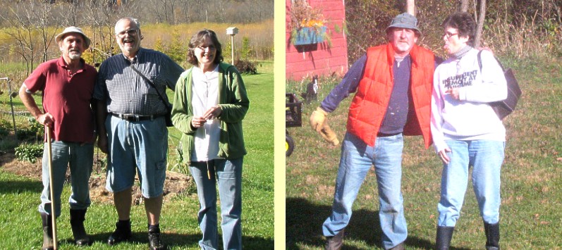 Left, Bob, Art and JoAnn by the garden plot; right, Jo shares her opinion with Bob about something he did.