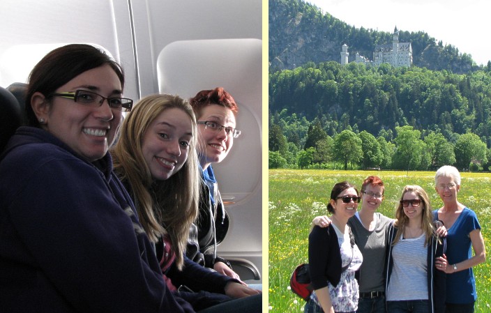 Left photo, Lacey, Katie and Mariya aboard the first leg of our flight when anticipation was high; right, we four gals in front of Neuschwanstein just before our visit. Bavarian King Ludwig's unfinished castle was the inspiration for Disney's Fantasyland castle.