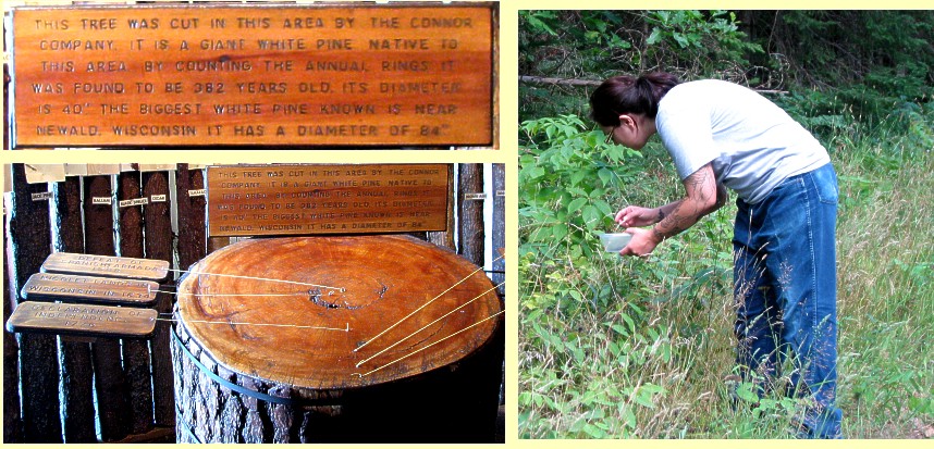 Lower left: trunk section of 382-year-old white pine tree; upper left: sign above
