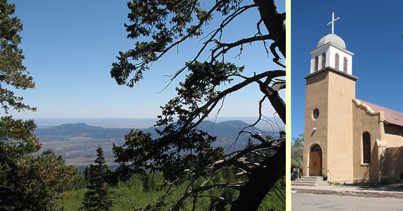 Left: View to the east from the Sandia Mountains; right: the old church in Cerrillos.