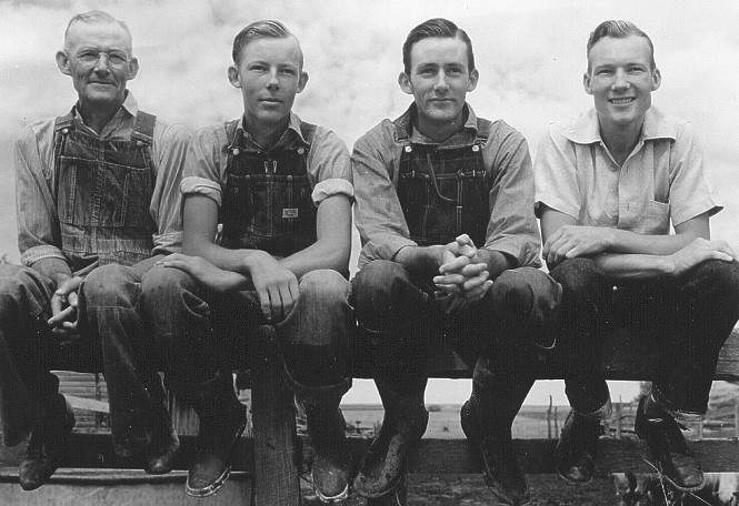 Left: Dad, Grandma, Uncle Bob, Uncle Stan and Grandpa on our west place farm;