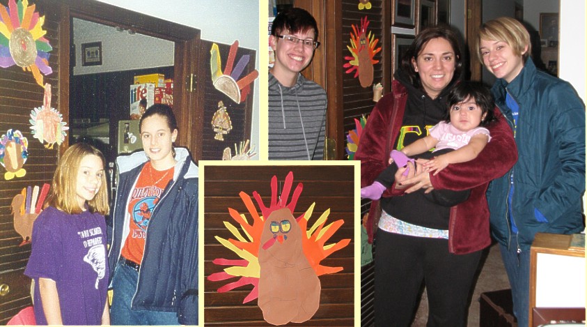 Left: Katie and Mariya with their turkeys in 2003; right: Mariya, spouse Lacey holding Lacey's niece and Katie with turkeys this year while "Turkey with a 'tude" looks on.