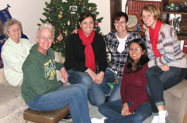 Five days after surgery, Mom Edla, left, focuses on Christmas with daughter Gloria, "adopted granddaughter" and Mariya's spouse Lacey, and granddaughters Mariya, Larisa and Katie.