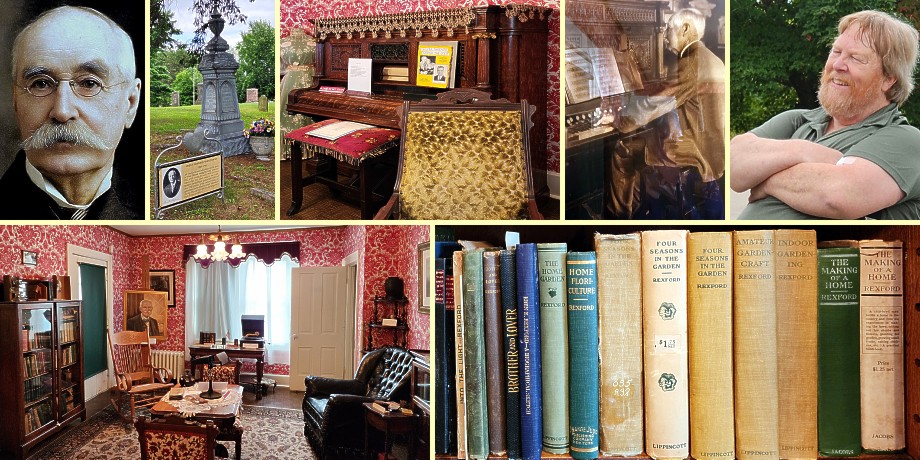 Top row (l-r): Rexford; Hattie and Eben's monument in the Bovina Cemetery; a player organ from the Rexford home; Rexford playing the player organ. He enjoyed repairing these instruments and giving them to churches that could not afford them; Al Mueller. Bottom row (l-r): Rexford room in Clintonville's History House; sampling of Eben's books in the Rexford room. (Rexford photo from hymntime.com)