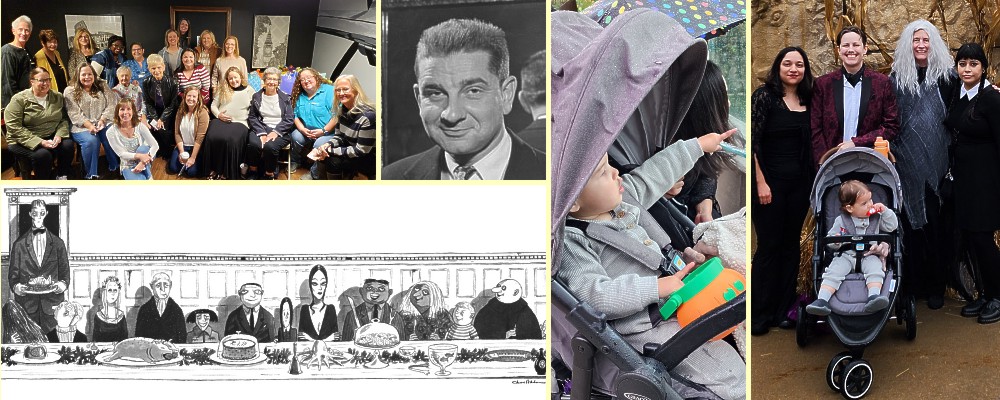 Top row (l-r): "Grandmama," (far left) - sans wig - at the shower; Charles Addams; Diana pointing at the tigers; "our" Addams family - (back): Miriam as Morticia, Mariya as Gomez, Gloria as Grandmama and Anabell as Wednesday, and (front) Diana as Pubert. Bottom-left: a Thanksgiving strip drawn by Addams. (Addams image from wikipedia.com, Thanksgiving strip from colgate.edu)