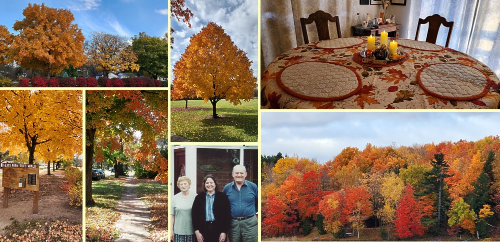 Top row (l-r): Orange, yellow, green and red against a dark-blue fall sky; a perfectly-shaped tree in its yellow fall coat; my tablecloth of leaves. Bottom row (l-r): a yellow and leafy walkway at a nearby park; red and green leaves over a brick sidewalk strewn with fallen leaves; Frida and Tom with Art's daughter Karen in 1999; the opposite shore at our lake in Wisconsin.