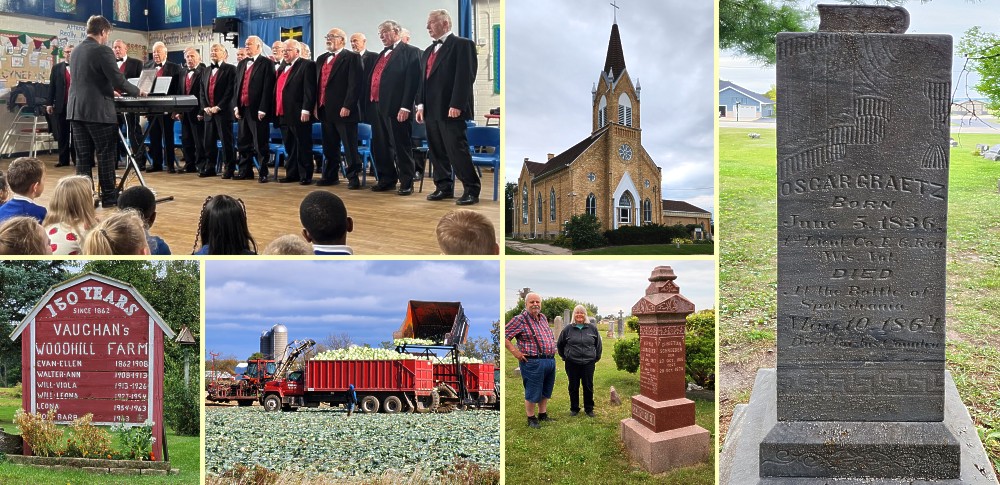 Top row (l-r): twenty members of the Froncysyllte Male Voice Choir perform for grades 3-to-6 at St. Anne's Catholic Primary School in Wrexham, Wales; Trinity Lutheran Church of Ellington Township near Appleton; memorial to Lieutenant Oscar Graetz, who died in the Civil War after being brought to America to escape the European wars. Bottom row (l-r): marker in yard of Vaughan farm; cabbage harvest near Shiocton, Wisconsin; Art and Kris next to grave marker for their great-great-grandparents Sophi and Christian Schoeder ( choir photo: https://stannespri.wrexham.sch.uk/)