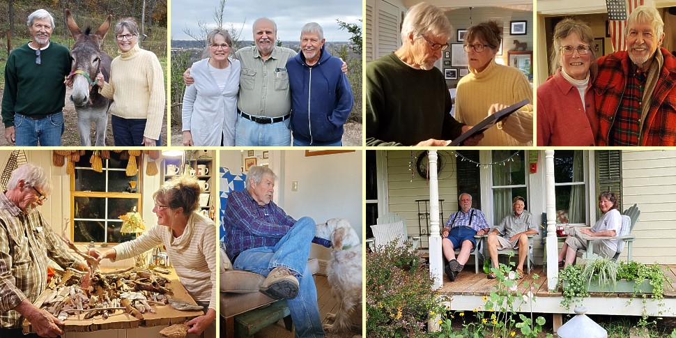 Top row (l-r): John helped Jo with her "donks;" Jo, Art and John at a lookout in Manhattan, Kansas; Jo explains a gift she made for John featuring a poem about a country columnist; Jo and John heading out to party. Bottom row (l-r): going through their "finds" from a road trip; John with his dog Skip; Art, John and Jo enjoying time on her porch.