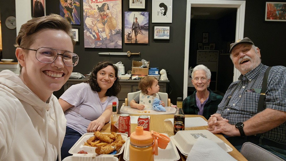 L-R: Mariya, Miriam, Diana, Gloria and Art gather for a meal of fish. Can you tell who DQ is really glad to see?