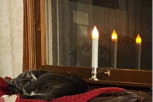Minnie sleeps by one of the candles